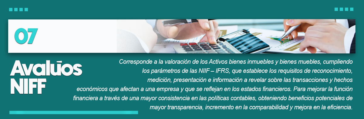 Somos una firma especializada en la valoración de activos, corretaje corporativo inmobiliario, creada con el fin de ofrecer un servicio personalizado e individualizado, más ágil, dinámico y basado en la asesoría personalizada al cliente. Nuestro estudio se basa en la realidad y el valor de las cosas, permitiéndonos crear un sello de marca propia en el sector, con objetividad, imparcialidad y transparencia. Nuestro objetivo principal es cumplir con las necesidades de nuestros clientes, para ello contamos con talento humano capacitado, con experiencia en valoración de activos, investigamos y aplicamos nuestros conocimientos, añadimos el factor creativo y transformamos las necesidades en realidades de un servicio con calidad.